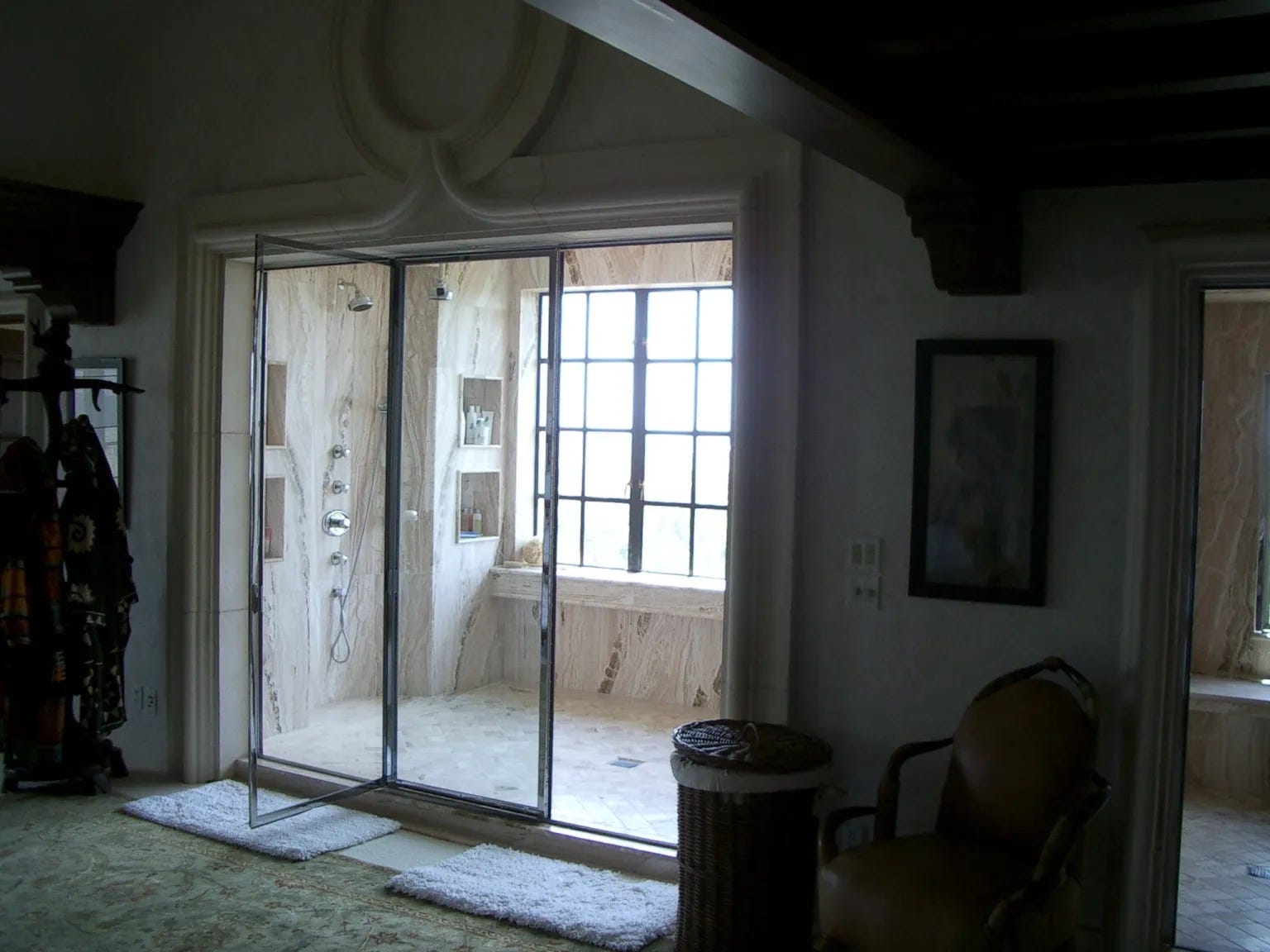 All of Epstein’s properties were equipped with shower and steam rooms made of marble, complete with benches. Survivors recount being teens ordered to sit in the floor of the shower to massage, bathe, groom and sexually please Epstein and others
