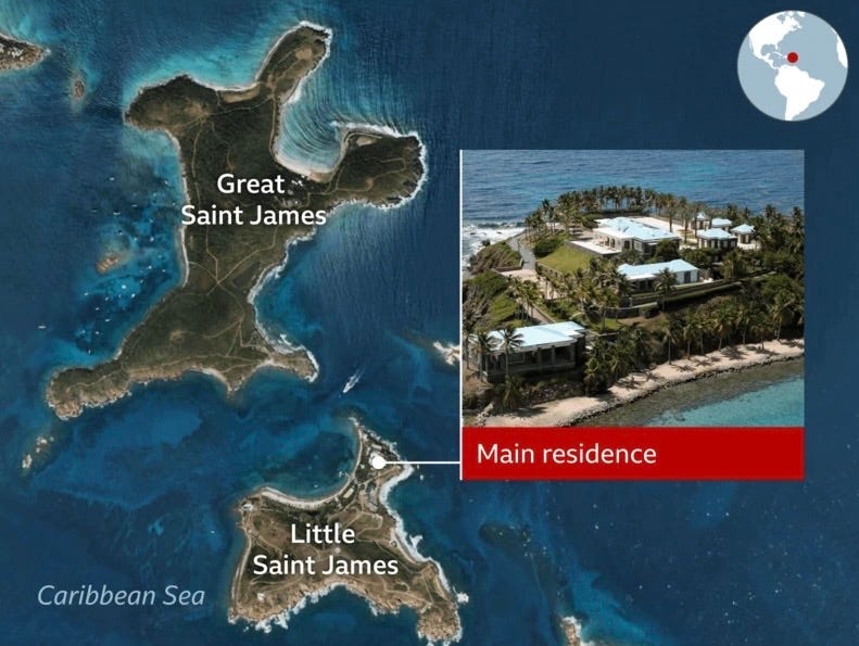 Epstein’s second island, Great St. James, has all but been erased from the narrative. But survivors remember it. Virginia Giuffre wrote about it in her unpublished memoir (the one Jeffrey Epstein’s estate had a copy of) so I chased the leads no one else touched—and here’s what they never reported.
