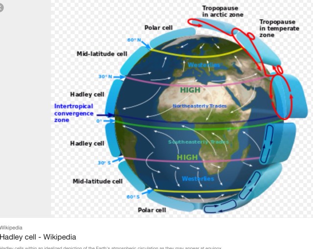 “The Hadley circulation is a tropical atmospheric circulation that rises near the equator. It is linked to the subtropical trade winds, tropical rainbelts, and affects the position of severe storms, hurricanes, and the jet stream. Where it descends in the subtropics, it can create desert-like conditions. The majority of Earth’s arid regions are located in areas beneath the descending parts of the Hadley circulation.