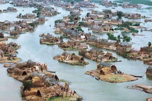 The same communal mudhif buildings seen in marsh culture today have also been seen depicted on Sumerian seals from 5000 years ago. There are also apparent similarities between the agricultural and irrigation practices of the ancient Sumerians and the modern day ‘Ma’dan’, as the present Marsh Arabs are known. The Sumerians also travelled in similar slender reed boats, caught fish and birds with long spears, lived on marsh islands in reed houses, and herded water buffalo, sheep and cattle.