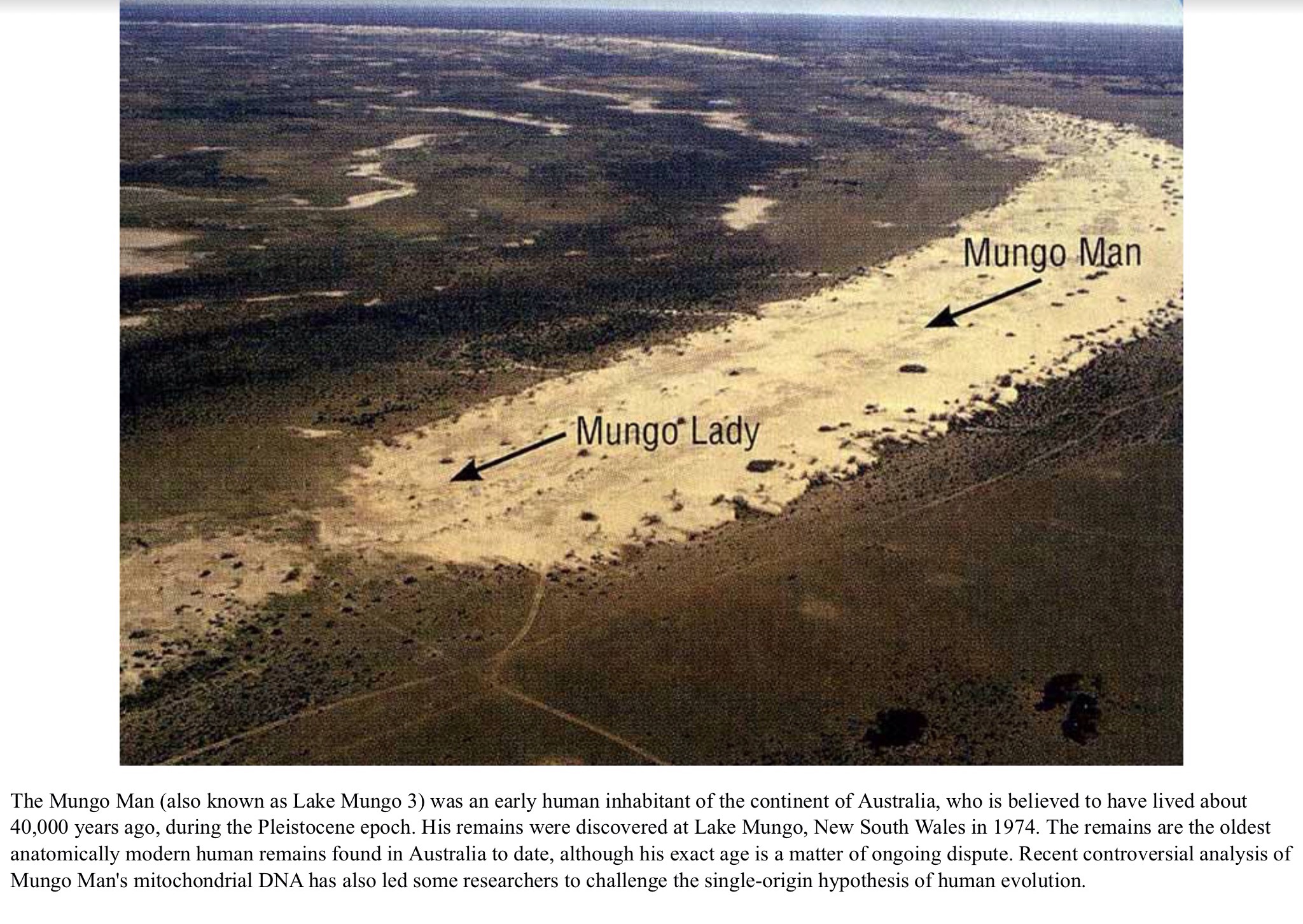 The Mungo Man was discovered by ANU archaeologist Dr. Jim Bowler on February 26, 1974 when shifting sand dunes exposed his remains. He was found near Lake Mungo, one of several dry lakes in the World Heritage listed Willandra Lakes Region. The body was sprinkled with red ochre, in what is the earliest incidence of such a sophisticated and artistic burial practice. This aspect of the discovery has been particularly significant to Indigenous Australians, since it indicates that certain cultural traditions have existed on the Australian continent for much longer than previously thought.
