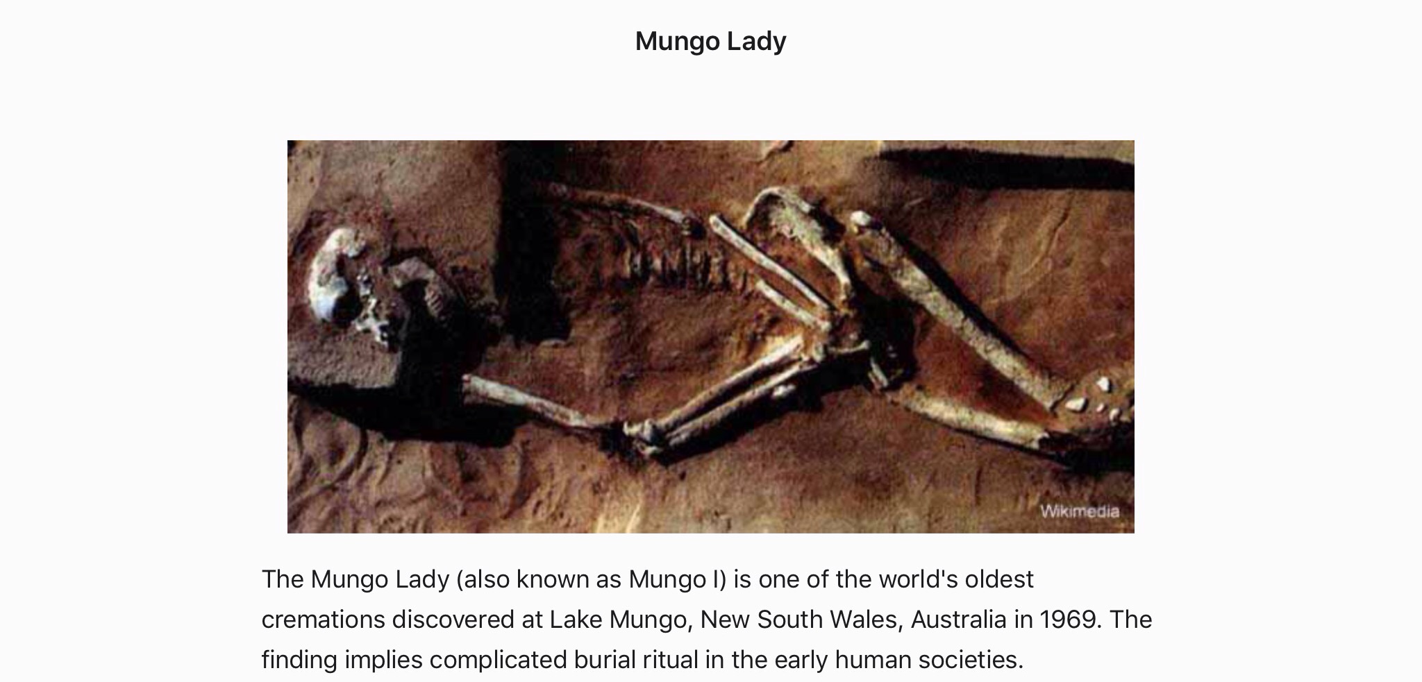 The pattern of burn marks on the bones of Mungo Lady implies an unusual ritual that after she died, the corpse was burned, smashed, then burned a second time. It was suspected that her descendants had tried to ensure that she did not return to haunt them.