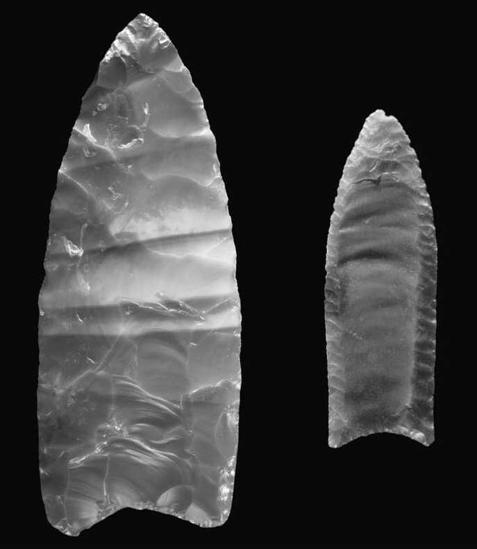 Clovis (left) and Folsom points (shown to scale; fluting at bases)