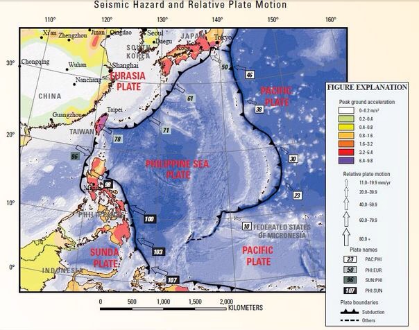 The Philippine Sea plate is east of the Eurasian plate. It is the bedrock of the major islands of the Philippines, Indonesia, Taiwan, and the Marianas.