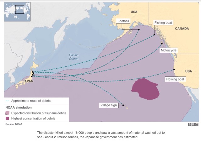 In recent years the dreadful earthquake and massive tsunami over Japan 11 March 2011 (see http://www.bbc.co.uk/news/world-asia-35638091) has led to years of debris crossing from Japan to Canada and the USA. Obviously people are sharing tragic stories ever since the event occurred, but the flow of debris is an opportunity to learn more about currents, winds and Pacific ocean flow. Looking at the graphic below one can imagine the natural, yet seemingly impossible, direction from east to west which might cause a human presence to cross this vastness somehow in the ancient past.