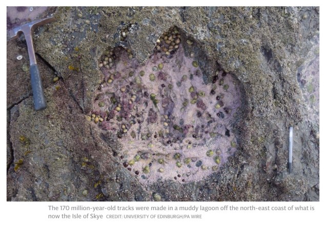 The 170 million-year-old tracks were made in a muddy lagoon off the north-east coast of what is now the Isle of Skye