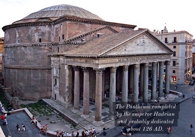 By the time the Pantheum was built, new building materials had evolved, initially this Roman temple was commissioned by the great Roman architect and General Marcus Agrippa. Its name from Greek Πάνθειον Pantheion, “[temple] of all the gods”) during the reign of Augustus (27 BC – 14 AD). A century after it was burned down, it was completed by the emperor Hadrian and probably dedicated about 126 AD.