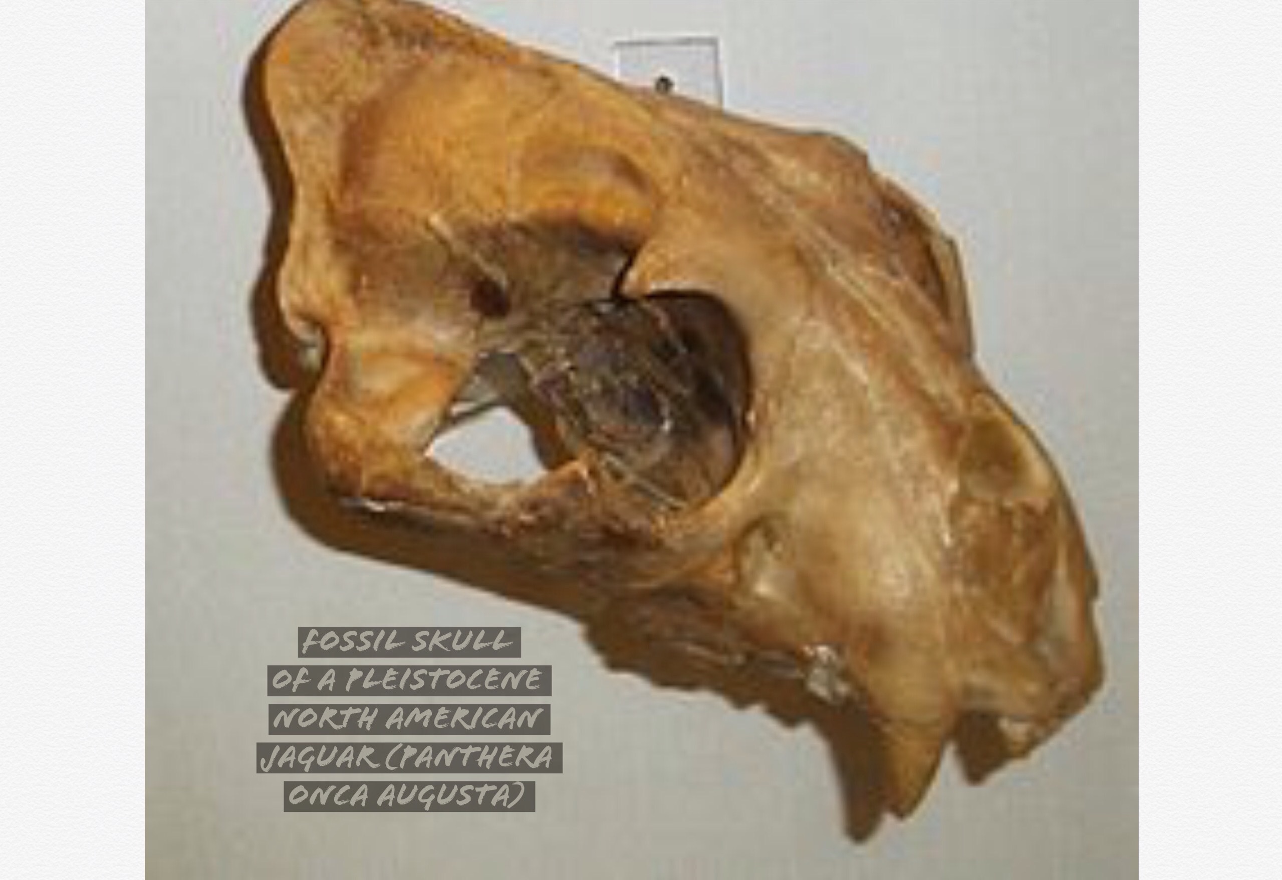 The modern jaguar is thought to have descended from a pantherine ancestor in Asia that crossed the Beringian land bridge into North America during the Early Pleistocene. From North America, it spread to Central and South America. The ancestral jaguar in North America is referred to as Panthera onca augusta.