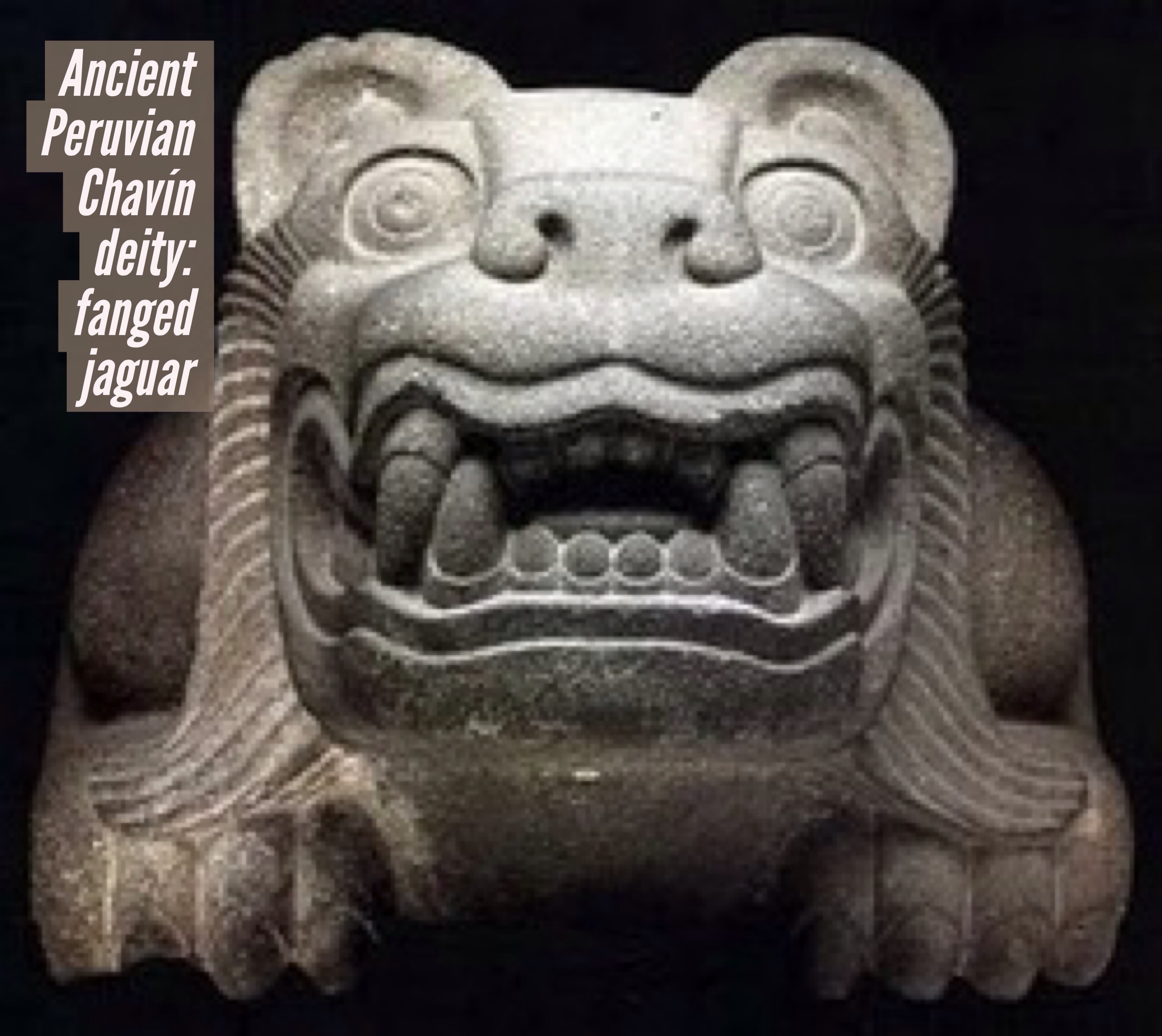 The Chavín Peruvian culture held its second most important deity as the fanged jaguar god, also a popular subject in Chavin art. These days as habitats for the Jaguar are destroyed by human hand to serve their own needs, it is more important than ever to preserve these magnificent creatures in the wild.