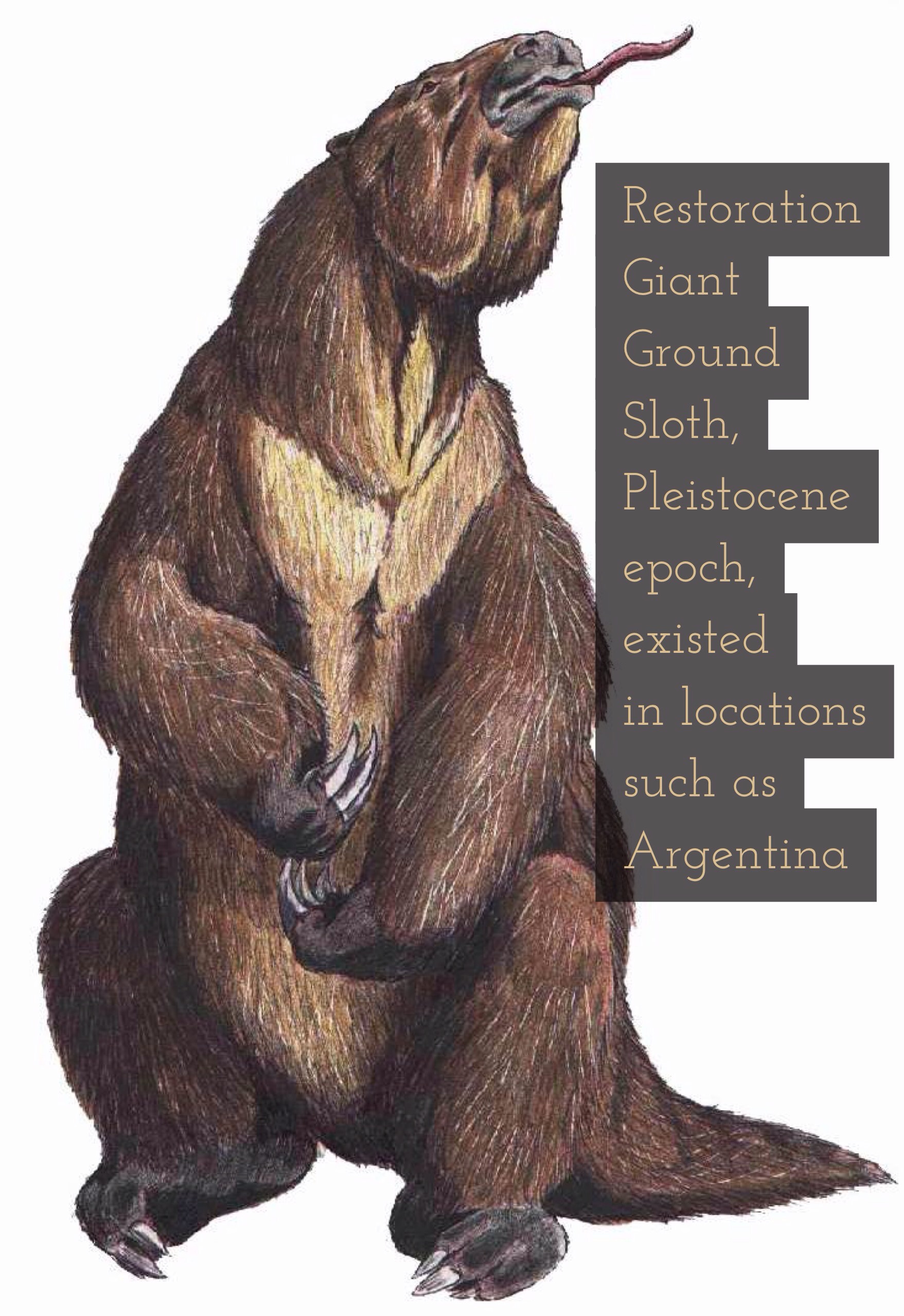 In Latin America, during the Early Pliocene through the end of the Pleistocene, there existed a giant ground sloth, a Megathereum Americanum. Megatherium was first discovered in 1788 on the bank of the Luján River in Argentina, the holotype specimen was then shipped to Spain the following year wherein it caught the attention of the esteemed paleontologist Georges Cuvier, Cuvier was the first to determine that Megatherium was a sloth.