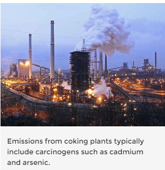 Coke oven emissions come from large ovens that are used to heat coal to produce coke, which is used to manufacture iron and steel. The emissions are complex mixtures of dust, vapors, and gases that typically include carcinogens such as cadmium and arsenic. Chemicals recovered from coke oven emissions are used as raw materials for producing items such as plastics, solvents, dyes, paints, and insulation.