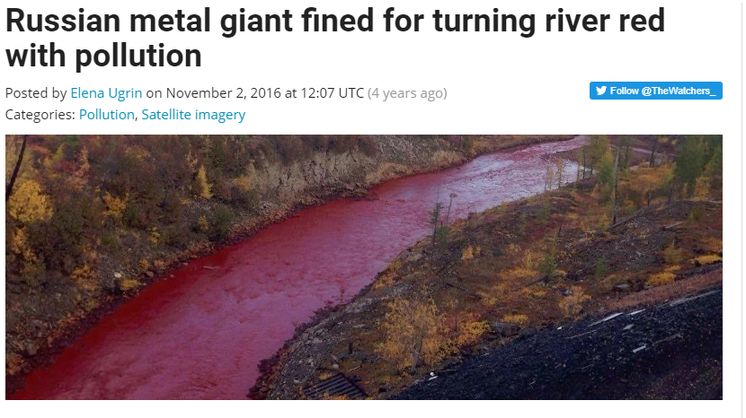 An article in the Guardian said: The company has a lot of ground to make up – its home city of Norilsk is rated one of the most polluted cities in the world, thanks largely to the 350,000 tonnes of sulphur dioxide emitted annually by the city’s nickel factory, which was decommissioned last year. In 2016, Norilsk Nickel made headlines when an overflow of oxidised nickel waste turned the city’s Daldykan river red.