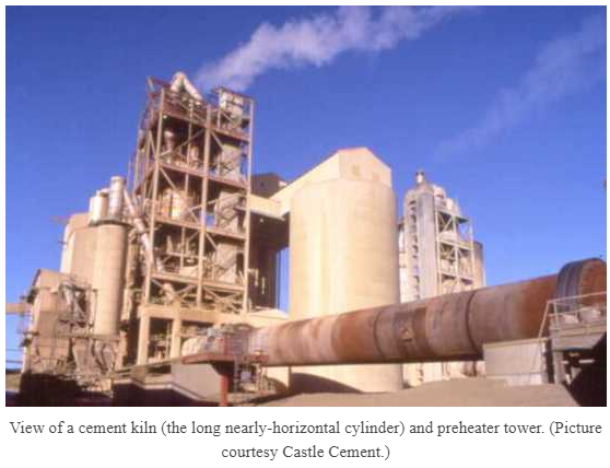The cement kiln heats all the ingredients to about 2,700 degrees Fahrenheit in huge cylindrical steel rotary kilns lined with special firebrick. Kilns are frequently as much as 12 feet in diameter—large enough to accommodate an automobile and longer in many instances than the height of a 40-story building. The large kilns are mounted with the axis inclined slightly from the horizontal.