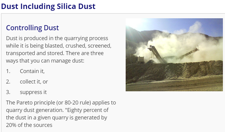 The well known disease, silicosis, is caused by breathing in the airborne silica dust, and is killing millions of workers and nearby members of communities, around the world. It is a slow and horrible way to die.