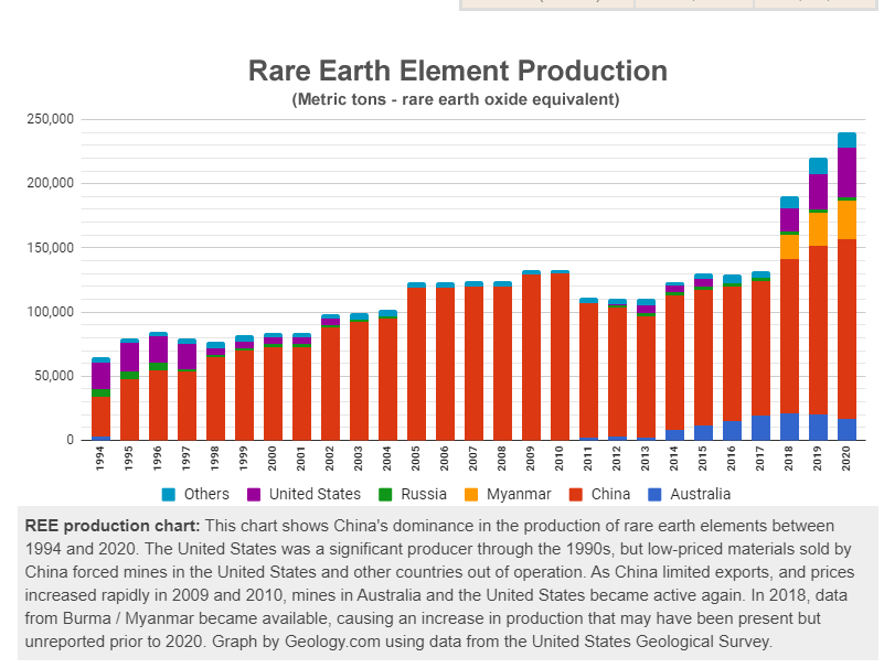 China has steadily dominated the market in supplying Rare Earths to the world, but it can limit supplies and push up costs, just as oil producers have done in the past. The ability to withdraw supplies if a country takes an action which offends China has made them unpopular to many of their major customers. Consequently, new sources are being mined around the world. Even close to the Chinese border, as in Myanmar, often carrying out illegal mining. But competition also is coming from Malaysia (at a cost to their tropical forests), and Russia.