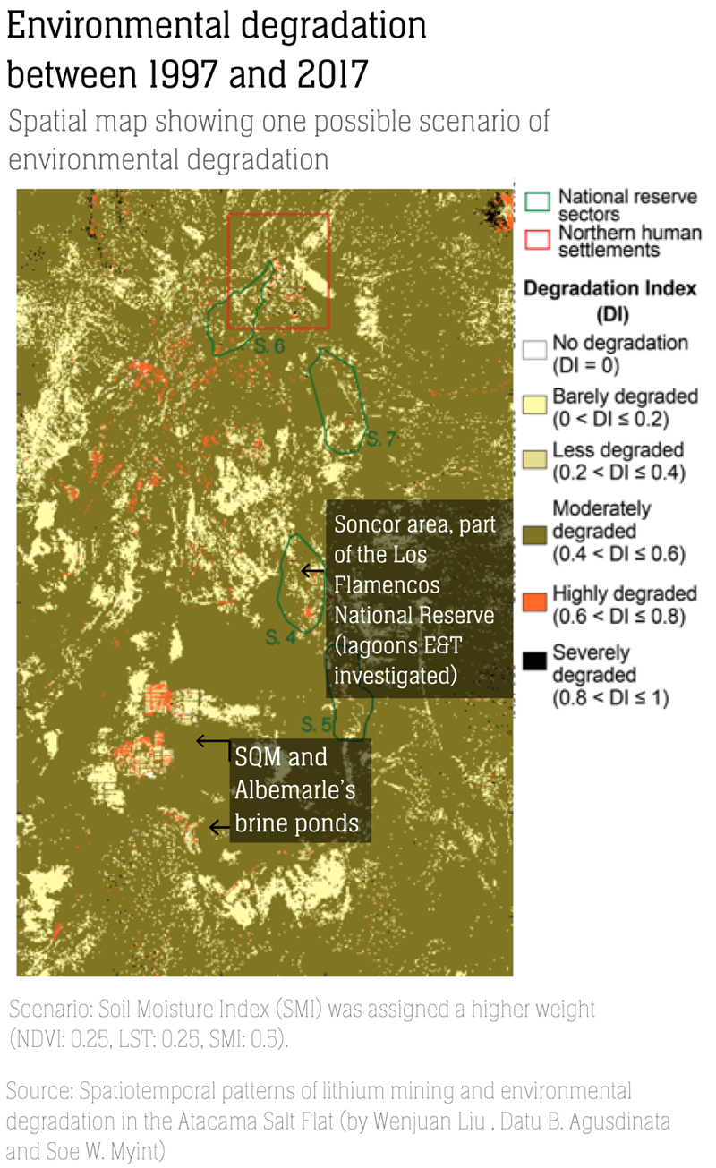 Arguably not 100 per cent caused by brine mining – a booming tourism industry and a slight population increase also contributed – the research identified lithium brine mining activities as one of the major stresses affecting local environmental degradation. Two decades, 1997-2017, were studied, recording soil moisture, vegetation and temperature. An expansion of lithium brine mining area of one square kilometre was found to correspond to a significant decrease in the average level of vegetation and in soil moisture.