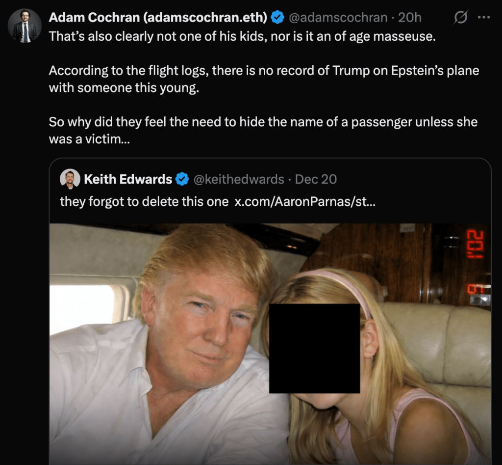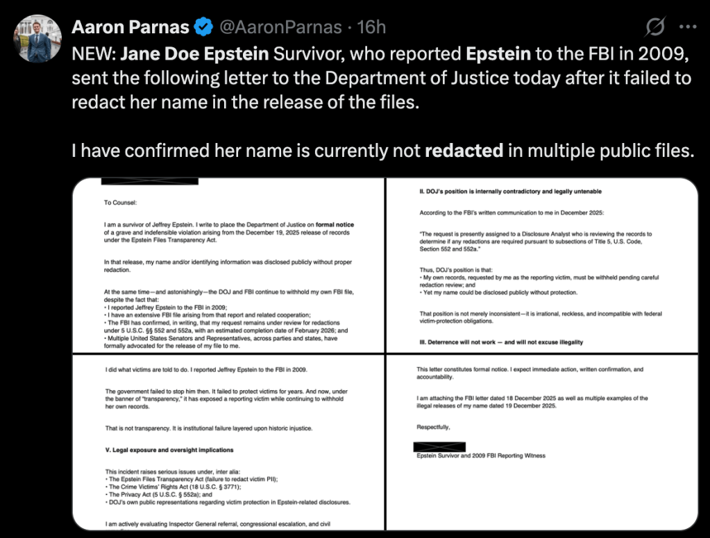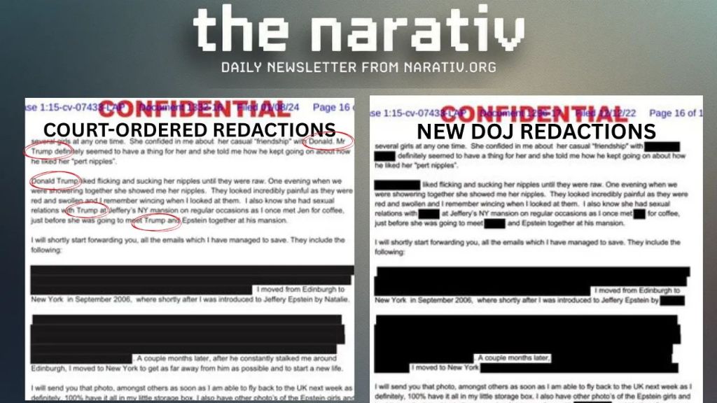 The DOJ redacted Trump’s name from explicit sexual abuse allegations in the Epstein files. An unredacted version of Case 1:15-cv-07433 states a witness was told “Donald Trump liked flicking and sucking her nipples until they were raw” and that she “had sexual relations with Trump at Jeffrey’s NY mansion on regular occasions”—allegations completely blacked out in the DOJ’s public release. The same document, same page, same case number—one version names Trump, the version DOJ released does not. The unredacted version was already in the public record from the Giuffre v. Maxwell civil case. The DOJ chose to add new redactions to information that was already public. Rep. Thomas Massie warned “a future DOJ could convict the current Attorney General” for selective compliance with the transparency law. Epstein victim Marina Lacerda demanded the DOJ “stop redacting names that don’t need to be redacted,” asking: “Who are we trying to protect?”
