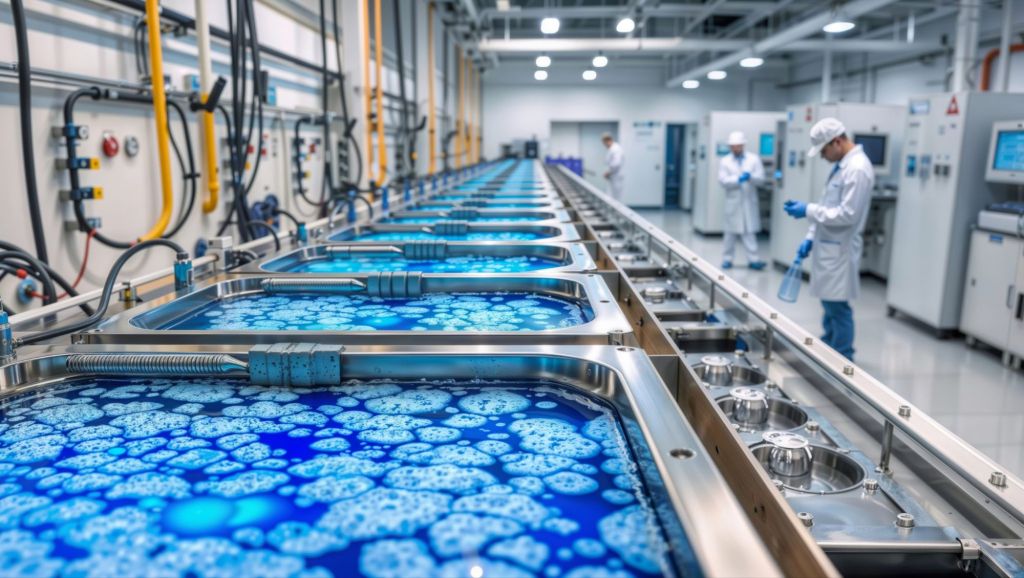 Rare Earth Metal Processing. Blue solution in tanks at a rare earth metal processing plant, with technicians in the background ensuring quality control and efficient production.